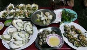 Ở đây có đầy đủ các loại hải sản từ sò điệp, ốc tỏi, nghêu, bạch tuộc đến hàu… Và có lẽ điều đặc biệt thu hút mọi người đến đây không những món ăn ở đây rẻ vô cùng mà còn ngon nữa chứ! Với mức giá “rẻ khó tin” đó nhưng món ăn ở đây cũng chất lượng lắm đấy, những con hàu to mập được nướng với mỡ hành dưới than đỏ hồng, mùi thơm nồng nàn khó cưỡng.